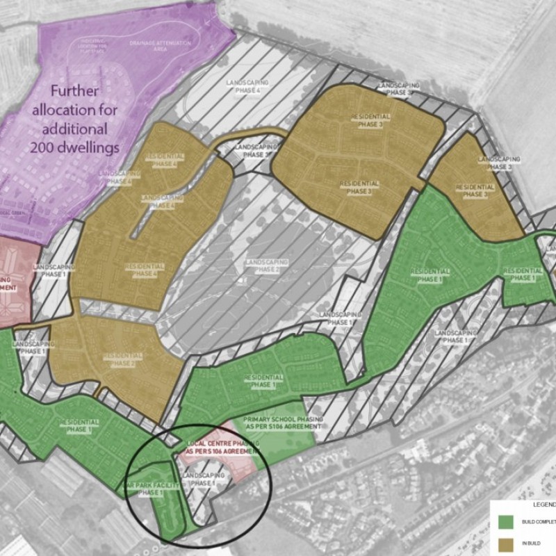 An outline Planning Permission was obtained in December 2014 for the construction of a sustainable mixed use urban extension comprising of up to 750 dwellings, a primary school , mixed use community hub and local centre to include retail development (use classes A1, A2, A3, A4 and A5), community building (D1 use class) and care home.