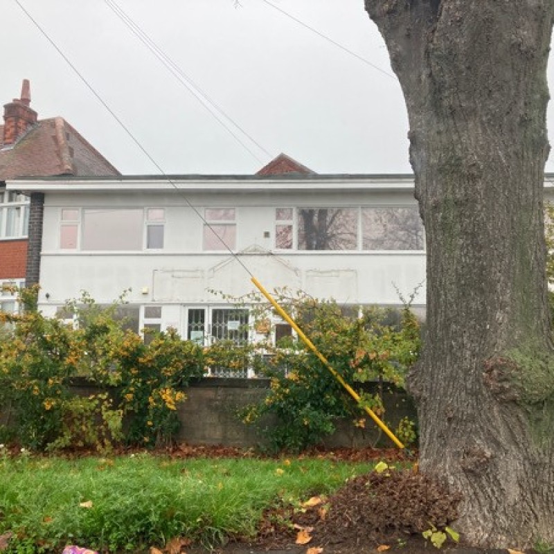 Empty office block and land at the back.
