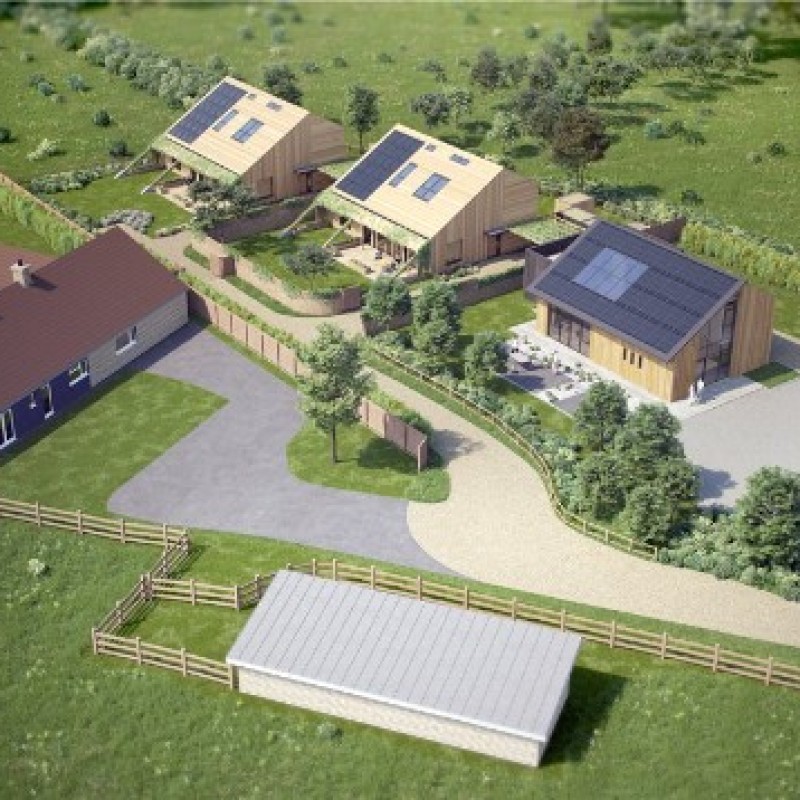Helios House plots were granted planning permission by North Somerset Council to build two detached high quality low carbon, low energy houses in March 2018, of sustainable design and construction. The elevations are clad in horizontal self-finished larch.